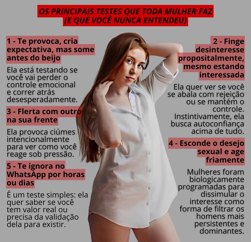 Todos os dias, inúmeros homens caem nos testes sutis que as mulheres fazem — testes que passam despercebidos, mas que definem quem será realmente escolhido. Eu mesmo já caí várias vezes, até entender como funciona o processo de seleção sexual no cérebro feminino. Hoje, ensino outros homens a dominar esse jogo silencioso.